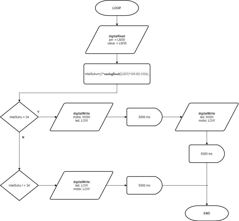Maka pada listing programnya, yang pertama silakukan pembacaan nilaiSuhu pada LM35 dengn kode : nilaiSuhu = digitalRead (LM35); kemudian dimasukkan rumus untuk mengitung nilai suhu yaitu nilaiSuhu = ((5*analogRead (LM35)*100.00)/1024); Lalu digunakan percabangan if else, dimana kondisinya ketika nilai suhu = 34, motor akan hidup selama 5 detik, kemudian mati, dan dilanjutkan dengan hidupnya LED, proses ini dieksekusi pada listing: